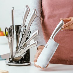Κατασκευασμένα από ανοξείδωτο ατσάλι 18/8, είναι εξαιρετικά ανθεκτικά και παραμένουν αιχμηρά στον χρόνο. Διαθέτουν εργονομικές λαβές για άνετο χειρισμό και προσφέρουν ακρίβεια και ταχύτητα στο κόψιμο. Συνοδεύονται από περιστρεφόμενη ακρυλική βάση για την εύκολη και ασφαλή αποθήκευση των μαχαιριών.