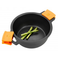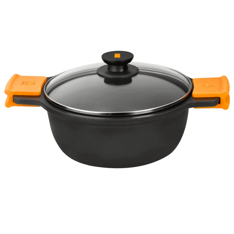 • Περιλαμβάνει γυάλινο καπάκι για να ελέγχετε με ευκολία το φαγητό και δύο πορτοκαλί λαβές σιλικόνης για να την κρατάτε την με ευκολία.
